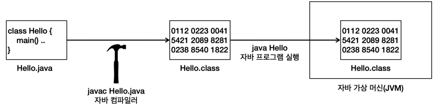 - OS 호환성 문제는 자바가 해결한다. Hello.class 와 같이 컴파일된 자바 파일은 모든 자바 환경에서 실행할 수 있다.